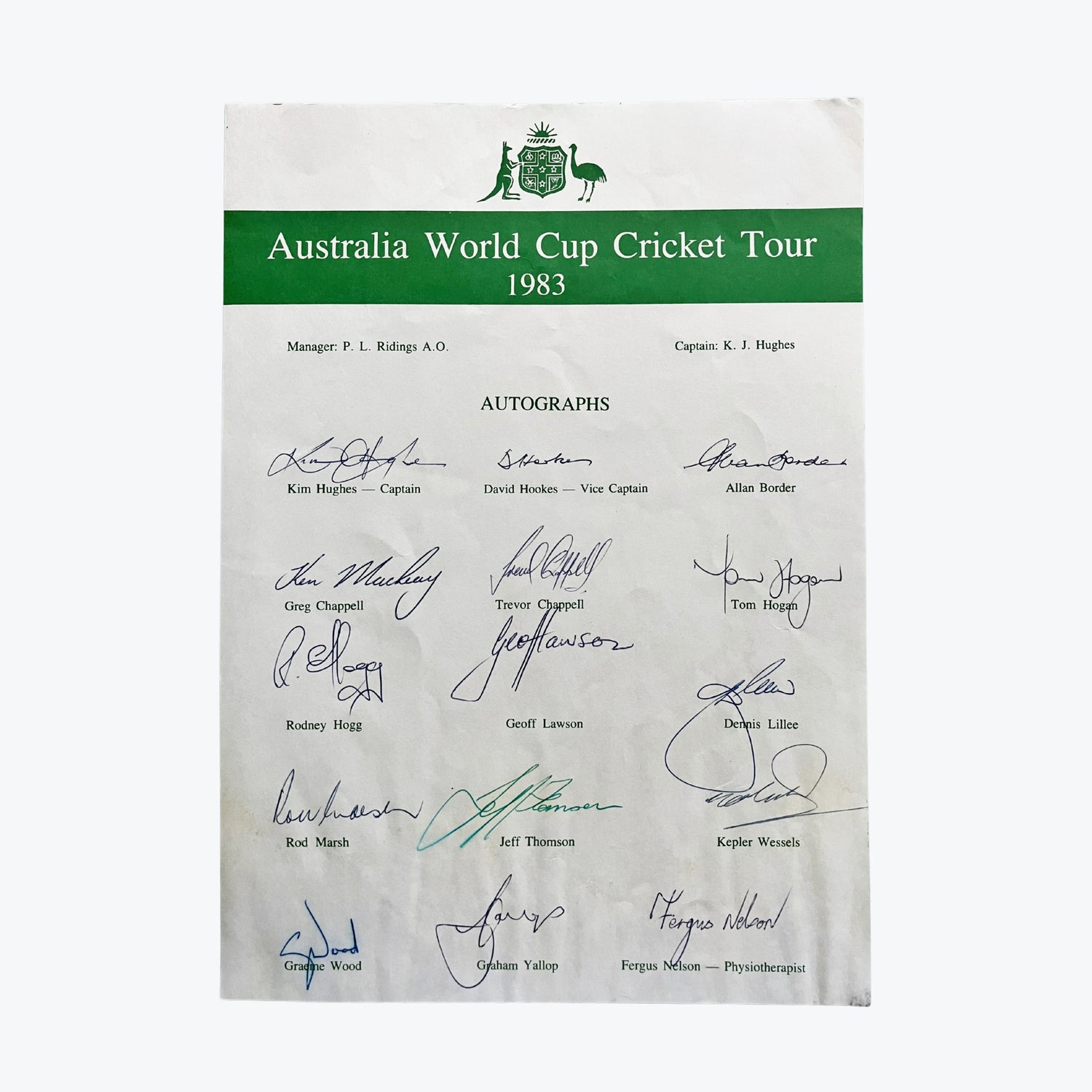 SIGNED: By Kim Hughes, David Hookes, Allan Border, Greg Chappell, Trevor Chappell, Tom Hogan, Rodney Hogg, Geoff Lawson, Dennis Lillee, Rod Marsh, Jeff Thomson, Kepler Wessels, Graeme Wood, Graham Yallop, and Fergus Nelson